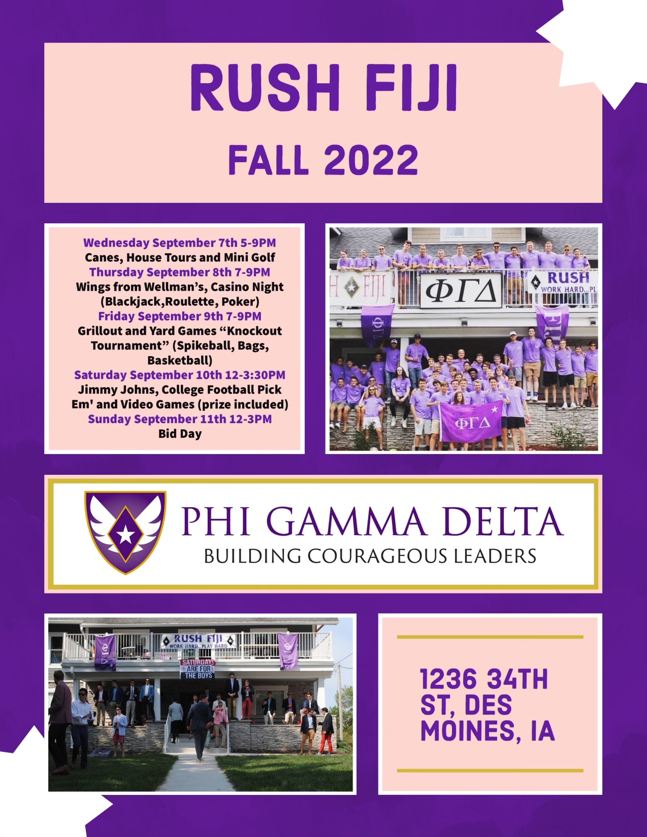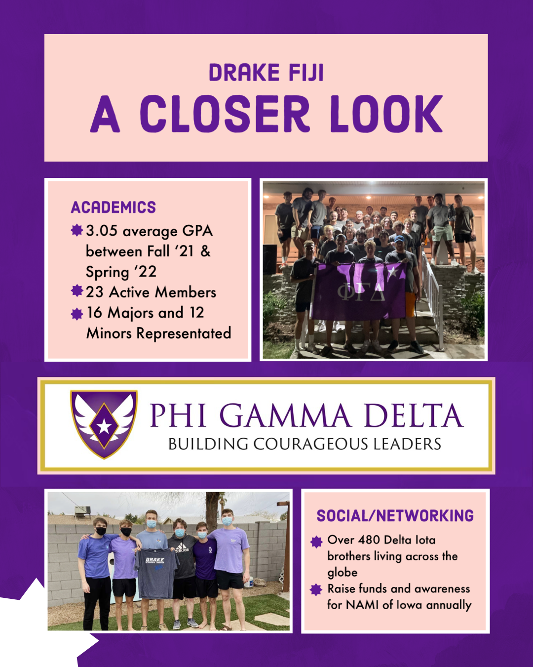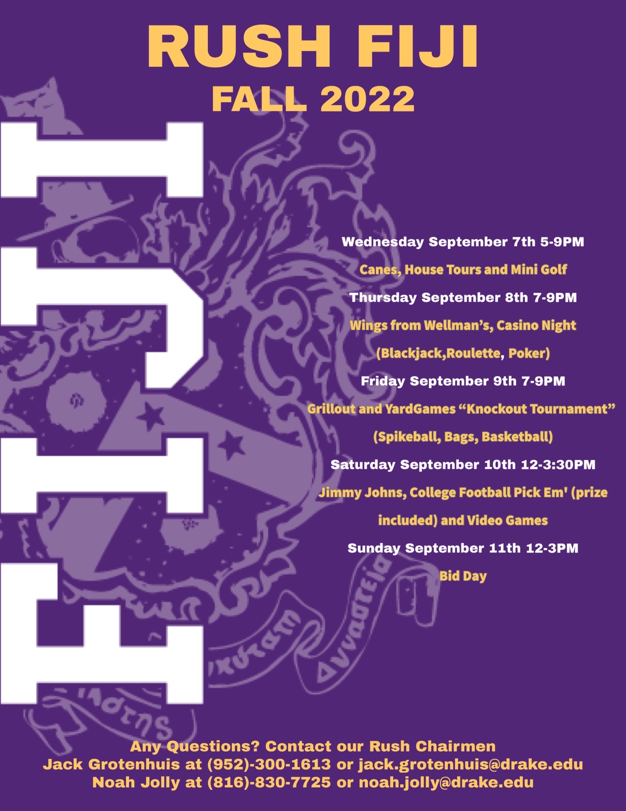 In case one missed formal recruitment at the beginning of the fall semester, informal recruitment can be a great avenue for exploring the opportunities that lie within greek life on campus. Those looking to becoming familiar with Drake Fiji can reach out to recruitment chairs Vartan Avedoumian and Max Sheridan.